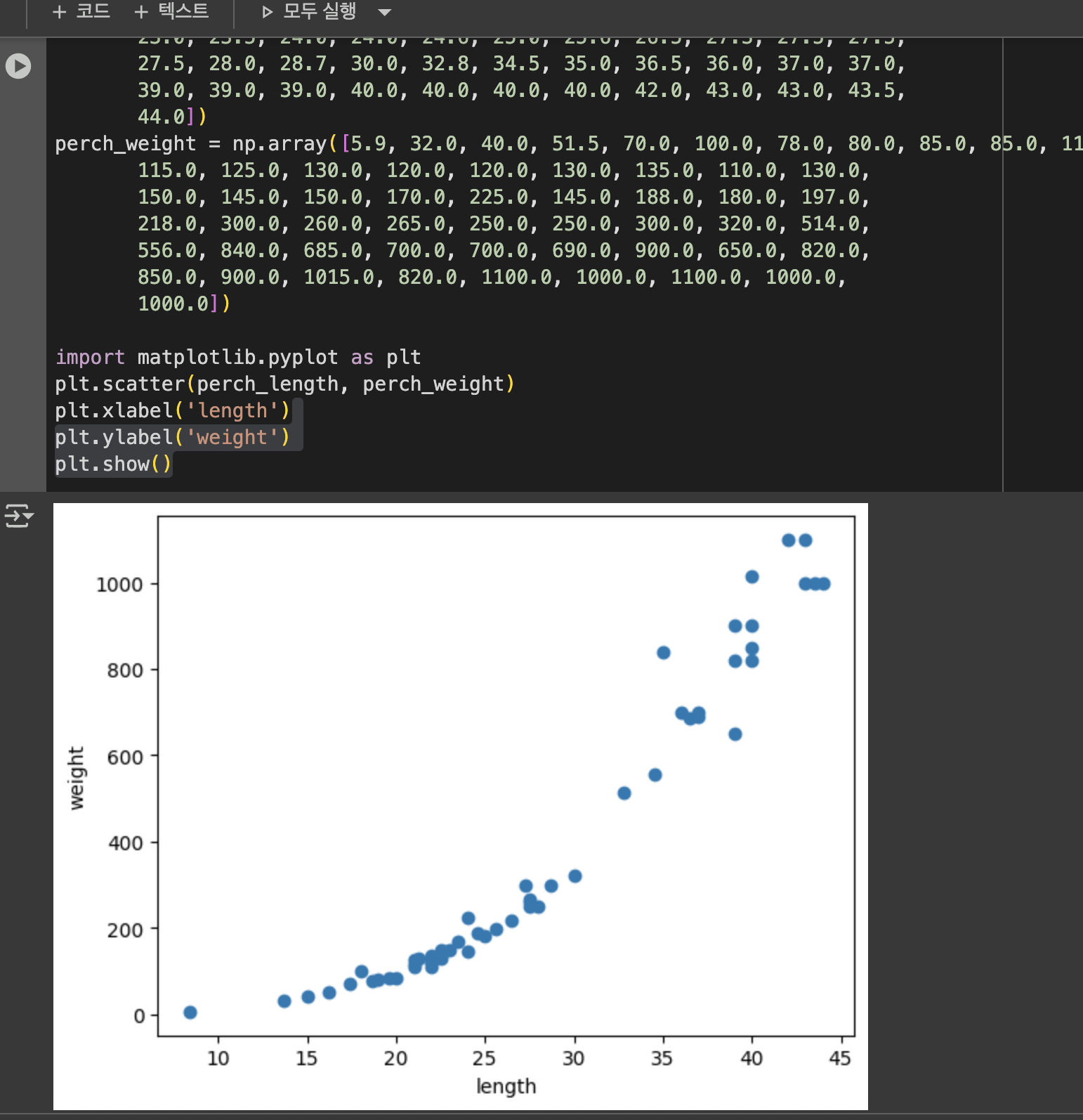 농어길이 길어짐에 따라 무게도 늘어남